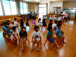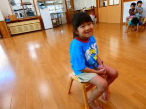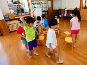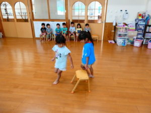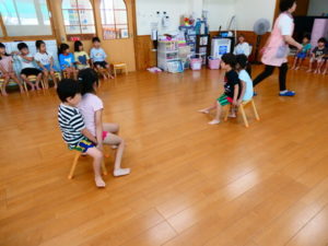 まずは、みんなが大好きな椅子取りゲームで、音楽がいつ止まるかソワソワしながら楽しむ姿、負けて涙する子どもも数名いました。
