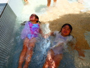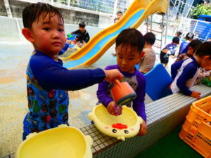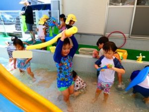 その後反対言葉カード遊び等をして、プール遊びをしています。