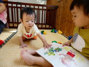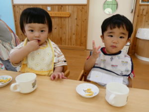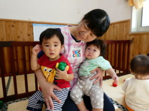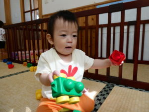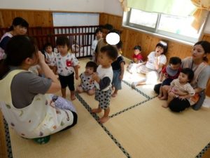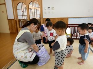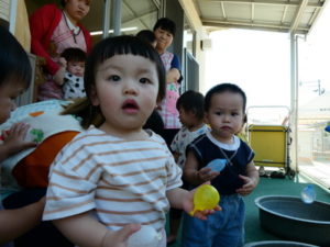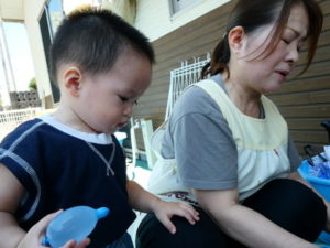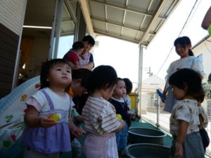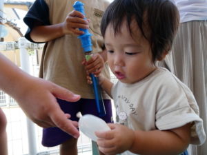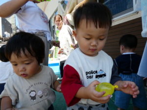 大きな輪っかで、でっかいシャボン玉を作ったり、せっせと水風船を作っていると、遊ぶより作るのを”したい、したい”と言う子ども達でした。