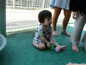 夏休みに入り、学童さんが食事介助などを手伝ってくれているのですが、学童さんも喜んで遊びに参加し、ひよこ🐣・りす🐿組さんもテラスに出て遊びましたよ。