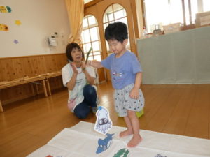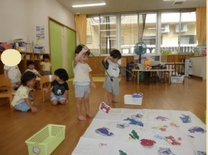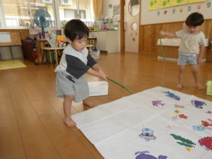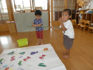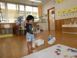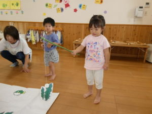 磁石を魚についているクリップに、上手に近づけて釣りあげられる子や、なかなかクリップに近づけられず手で持っていこうとする子と、それぞれに工夫しながら魚釣りを楽しむ様子が見られました🎣