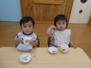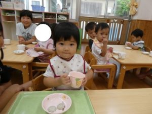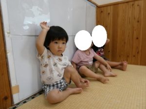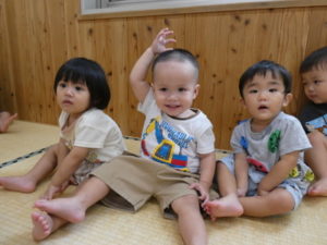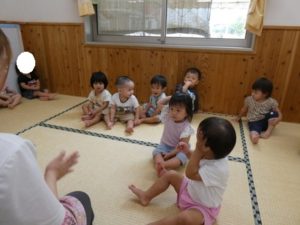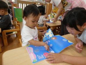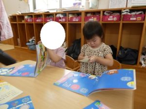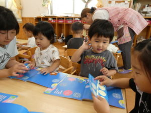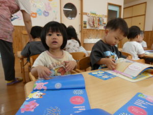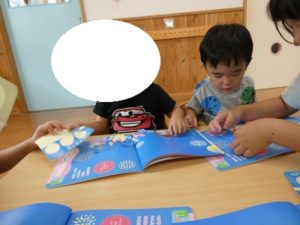りす組はお集まりをした後、8月の月刊絵本を読みまシールを貼りました。自分で台紙からシールを剥がして、好きな所へ貼って楽しみました。
