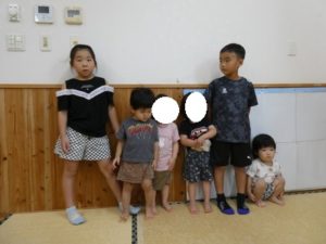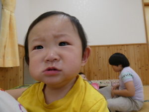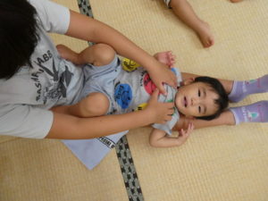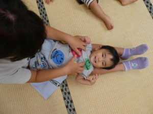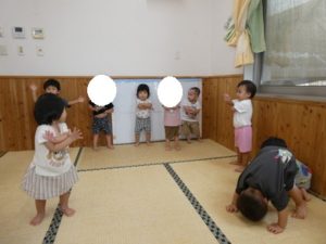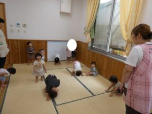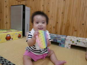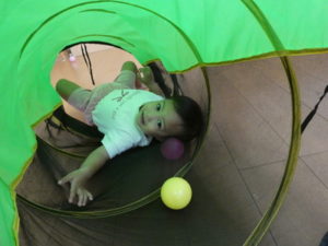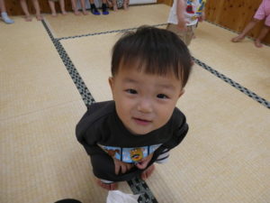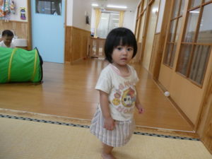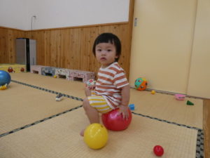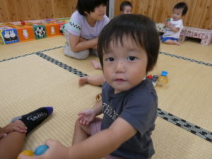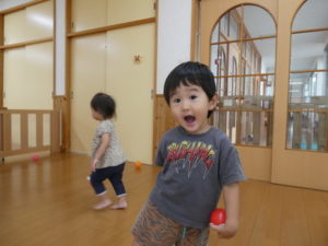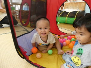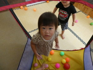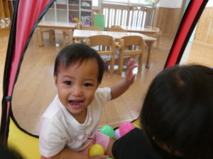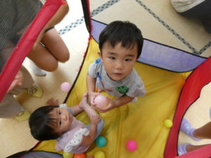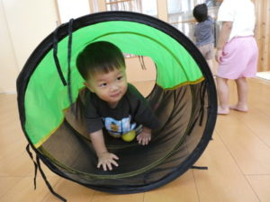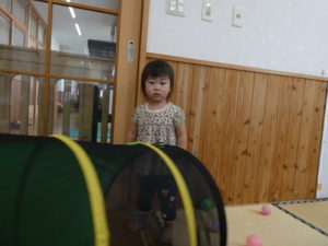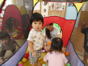 シール貼りを楽しんだ後は、ボール遊びや、トンネルで遊びました。トンネルに次々入り「ばぁ!」と楽しむ子どもや、ボールをボールハウスの上に投げて遊ぶ子どもがいました。雨でプール遊びが出来ず残念そうな子ども達でしたが、室内で体を動かして思いっきり楽しむ姿を見る事が出来てよかったです。