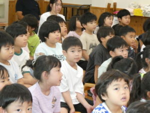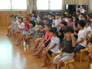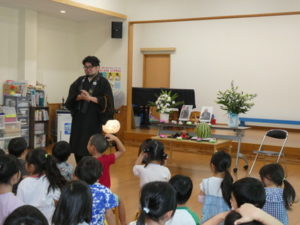 今日は、田島井戸方の光徳寺よりご住職の隈部香佑様をお招きし、くま組、きりん組、学童、放デイの子ども達に講話を頂きました。
