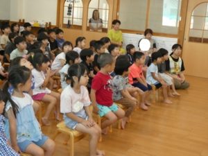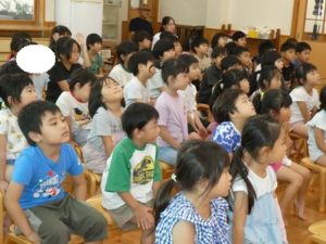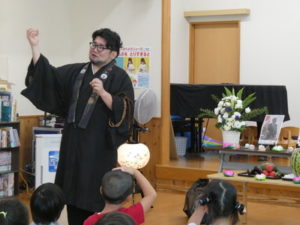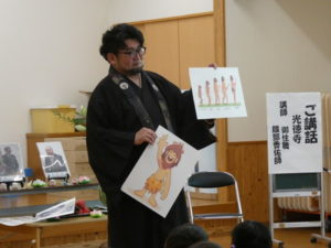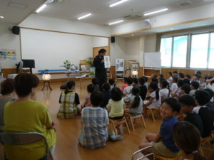 まず、最初に合掌しお経を上げて頂き話に入りました。「楽しい、嬉しい、怖い話のどれがいい?の質問に、「怖い!」と口をそろえて言いちょっと怖い話になりました。