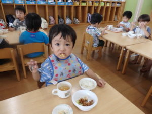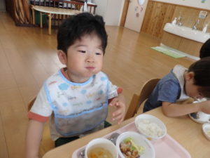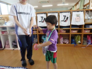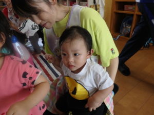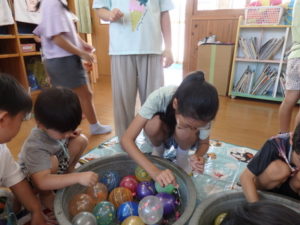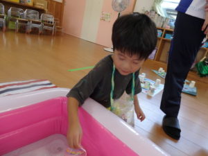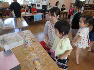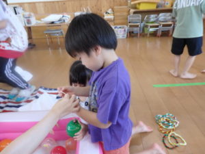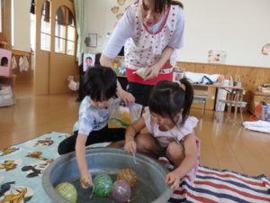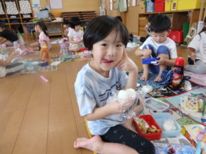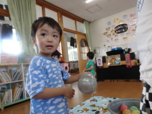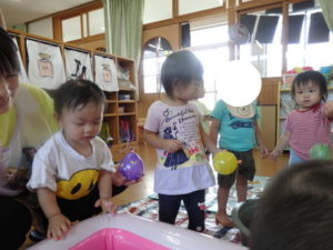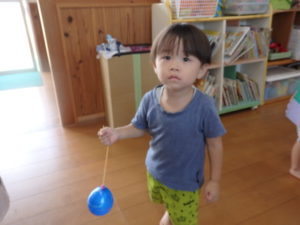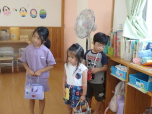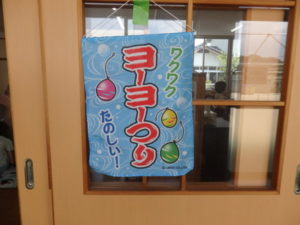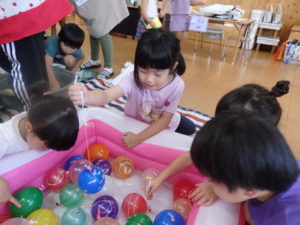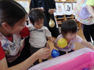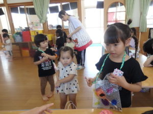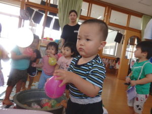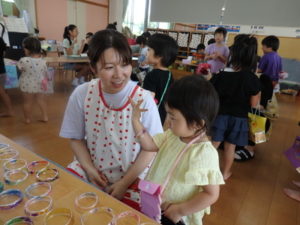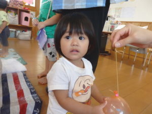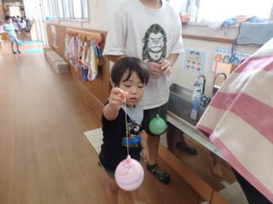 ヨーヨー釣りは大人気で、ヨーヨーが釣れるととっても嬉しそうな子どもの様子が見られました。うさぎ組、りす組も参加し、ゴムの所を持って揺らすのを楽しむ姿が見られました。
