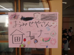 子ども達、職員で話し合いながらりんご飴、綿菓子、アクセサリーを手作りして屋台のようにしました。看板はきりん組が用意しました。また、お店屋さんごっこにもつながるので、各クラスお財布と、買ったものを入れるバックも用意しました。