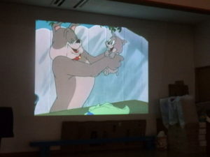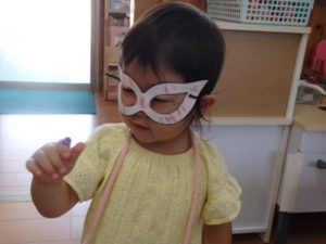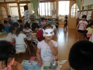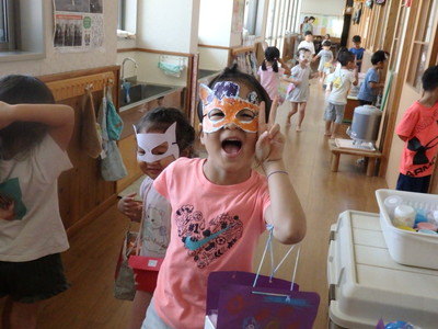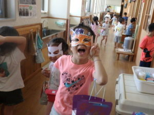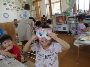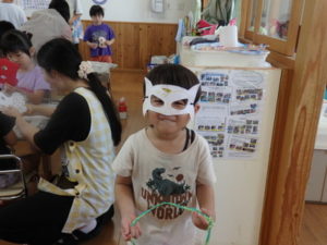 きりん組は製作の「おめん」コーナー、くま組はお店屋さんで、りんご飴、綿菓子、アクセサリー、ぱんだ組はヨーヨー釣りと輪投げランチルームでは映画を上映し、ポップコーン(本物)を食べながら鑑賞していました。