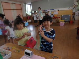 お店のコーナーでは、学童さんが元気いっぱい呼び込みをして保育園児は自分の財布からお金を取り出し渡して自分の好きな、アクセサリーや手裏剣を買っていました。