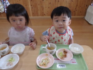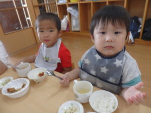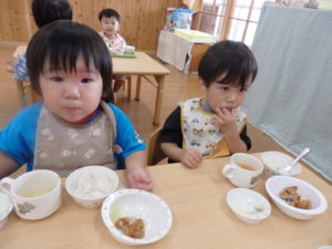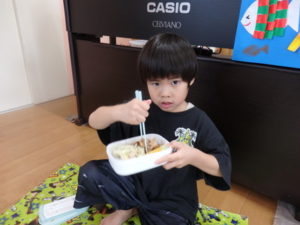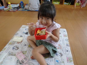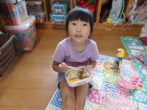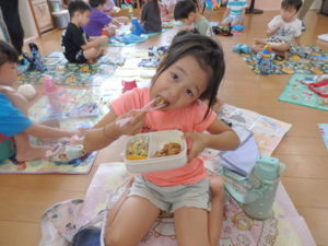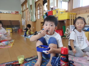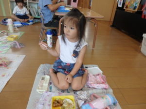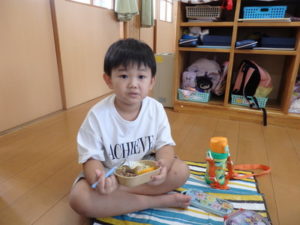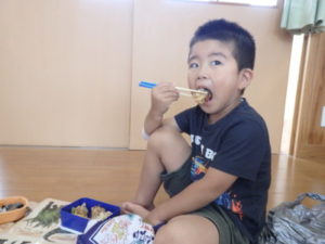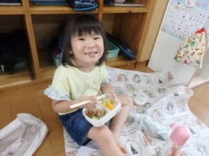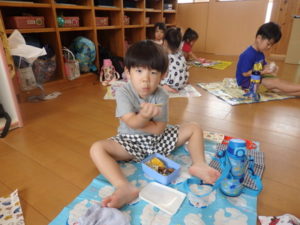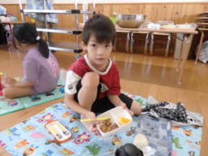 終わってからは、給食をお弁当箱に詰めて自分の好きなところで食べました。