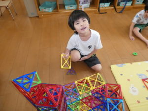 朝、登園してすぐ「お泊り保育楽しかったねー❣」「また行きたいねー❣」と言いながら、会話を楽しんでいました。