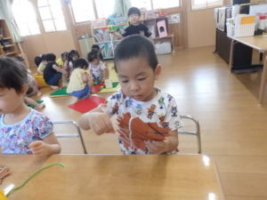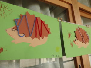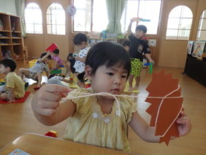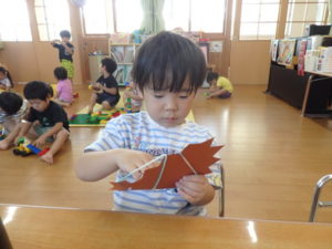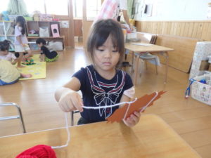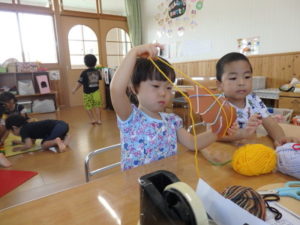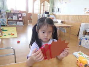 ギザギザに切った画用紙に、毛糸をクルクル巻いていくのですが、子ども達には巻き付けるのが難しく、なかなか思い通りにはいかなかったようです。