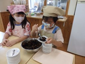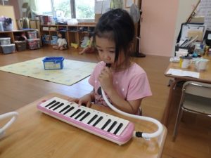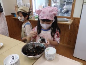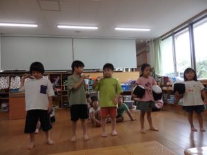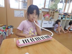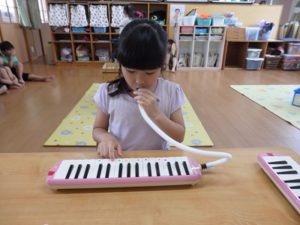 今月からは給食当番も始めました。就学に向けて少しずつ成長していくきりん組です。まずは、11月の発表会に向けてコツコツ練習を頑張っている所です。