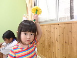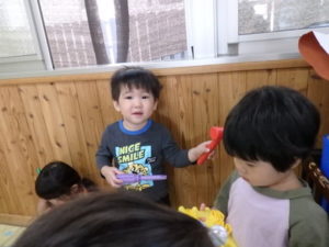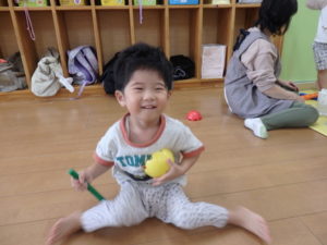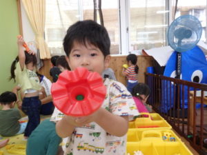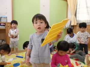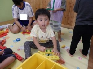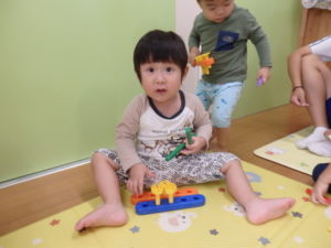 今日は、リズム打ちの練習をしたり、室内で工具ブロックを使用して、色々な形を組み立てて遊んでいます。
