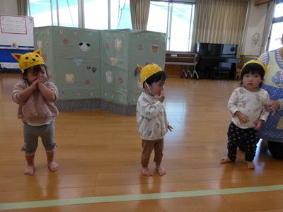 今日は、ランチルームで発表会の練習と、ほかのクラスの鑑賞会をしました。