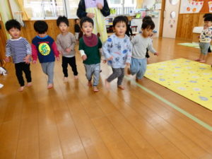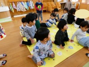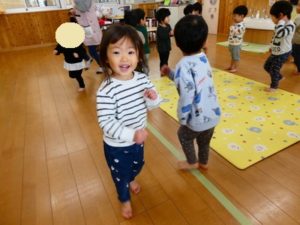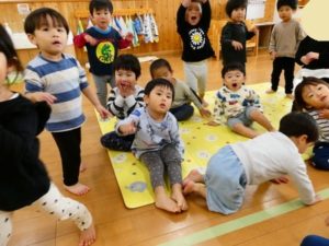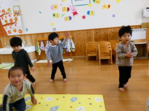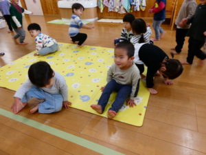 「足」「おへそ」と、言われた部位をマットにつける運動遊びを楽しみました。