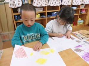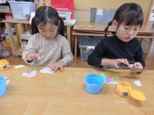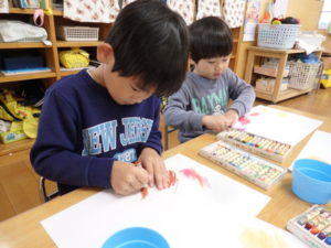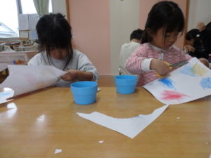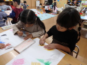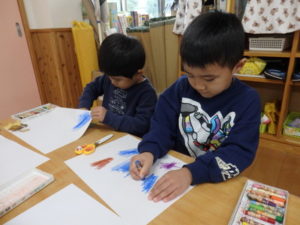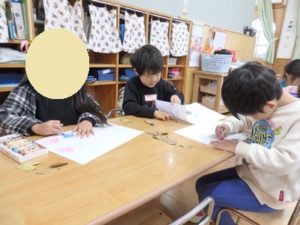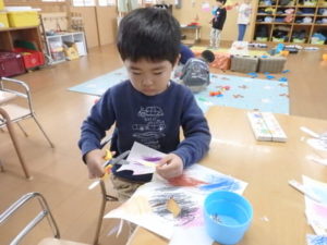 朝のマラソン、きりん組🦒さんと縦割りリレーをして温もった後は、製作をしました。