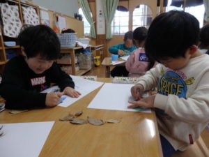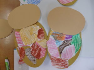拾ってきた落ち葉を使って、フロッタージュという技法で落ち葉を描き、ミノムシの体に貼っていきました。