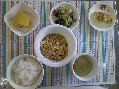 今日の給食は、沢山の具材が入った入り豆腐でした。