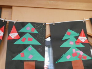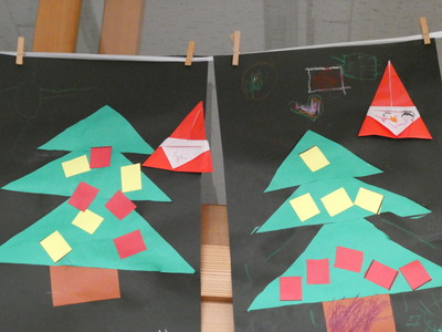 保育士が折るのを見ながら、同じように折るよう促しますが「わからーん」の声もあり、保育士が手伝ったところも多かったです。(手伝っていたので写真は撮れませんでした・・・)何とか、サンタクロースを折り、クレヨンで顔を描き、周りにはお飾りのようなものを描いていました。それぞれかわいいツリーが出来ました。