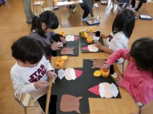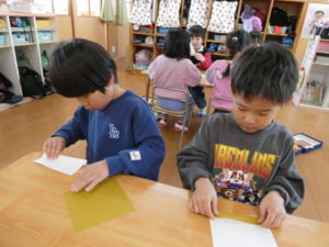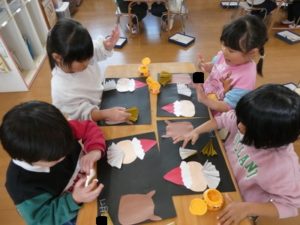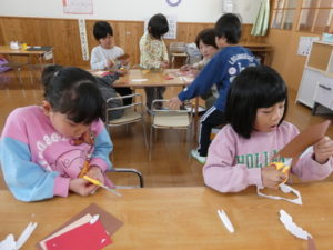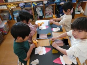きりん組🦒さんは、なんでも急ごうとする姿が見られ、制作が雑になりがちなので「丁寧にきれいに作ろうね」と声をかけながら作成しました。