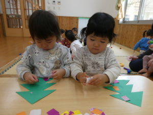 ツリー🎄の画用紙に、小さく切った折り紙を貼っていきました。