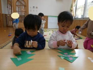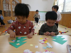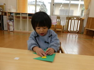 折り紙の後ろに貼ってあるシールを剥がすことに、苦戦する姿もありましたが、「やってみよう」と挑戦して頑張る姿が見られました。