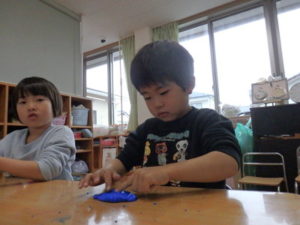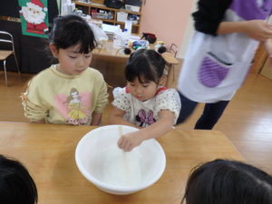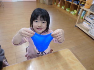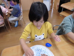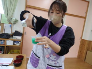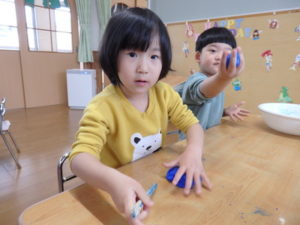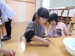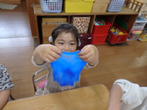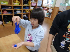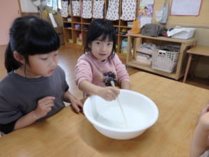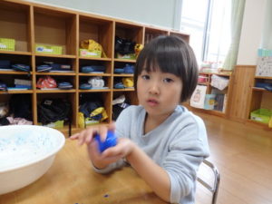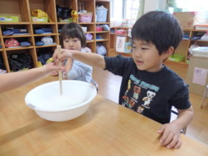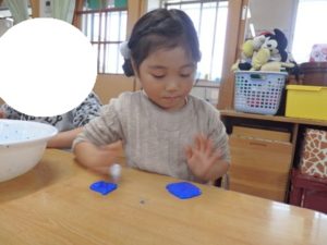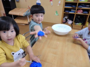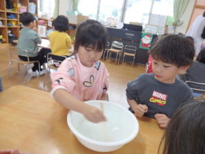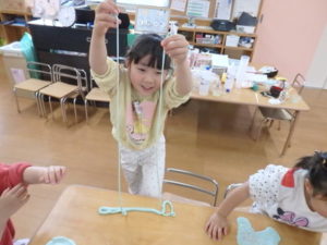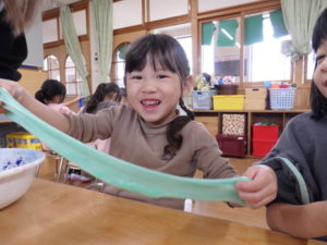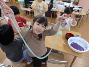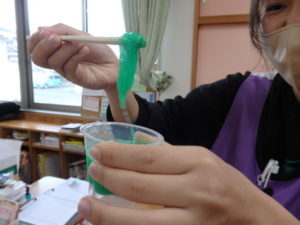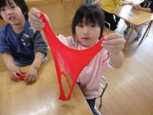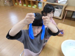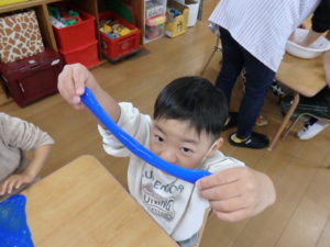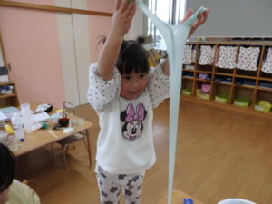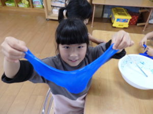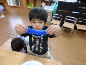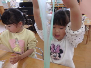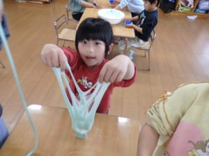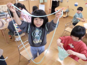 その後、自分達で作っていくと、難しくてなかなかうまく出来上がらずにいましたが、水や洗濯のりを調節して、とても伸びるスライムができました。