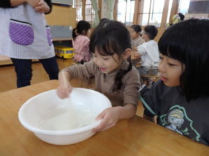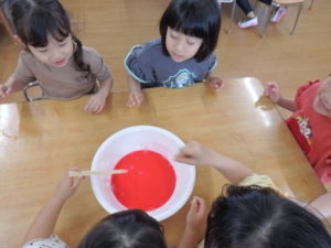 まずは、保育者が作ったスライムを見てビックリする子ども達。