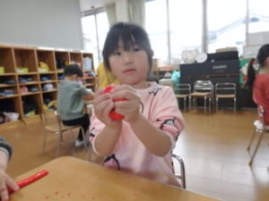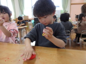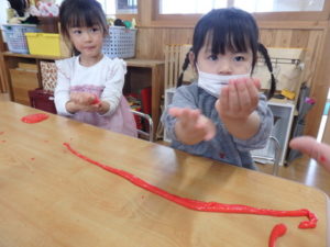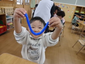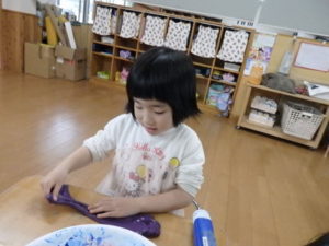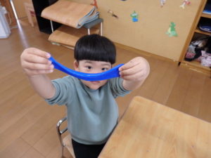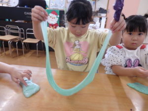お友達と伸ばす対決をしたり、スライムでブレスレットやドーナツ🍩を作ってみる姿が見られました。