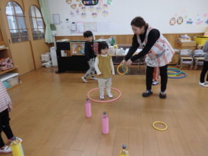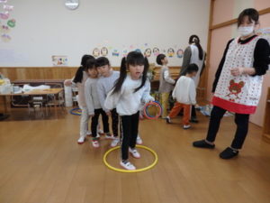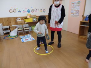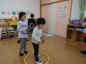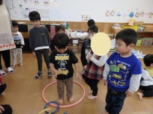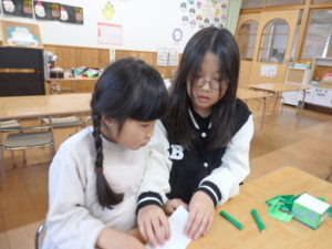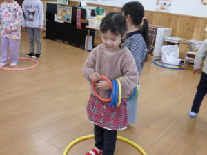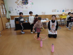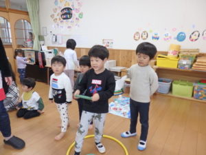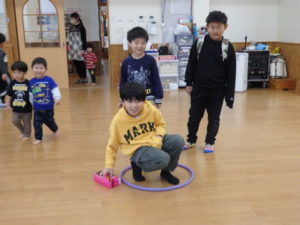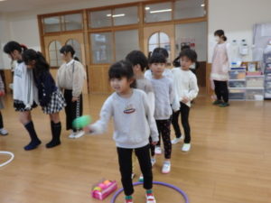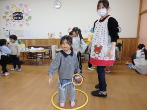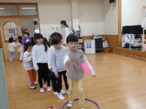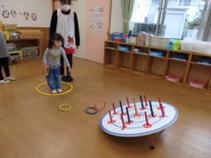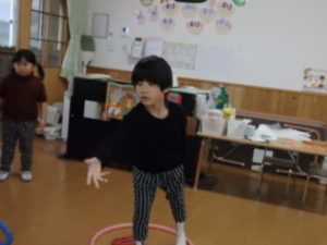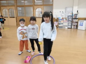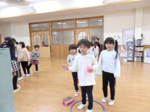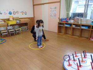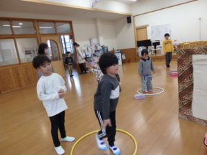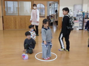 ゲームコーナーでは、輪投げとボール入れをしました。初めから高得点を狙う子もいれば、手前から順に狙う子。これまた様々でした。園児が来ると投げる目印のフープを近くに動かしてくれる小学生。ボールが入ると手をたたいて自分のことのように喜んでいました。