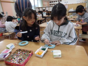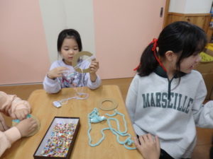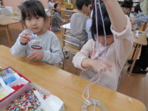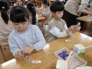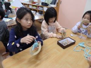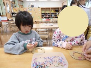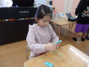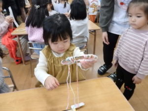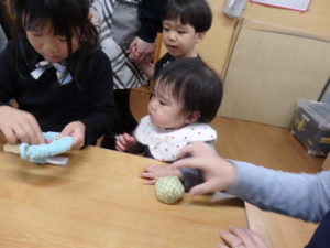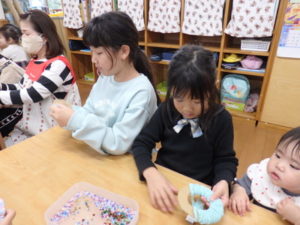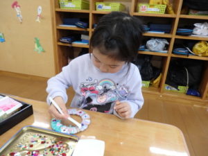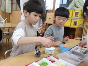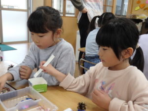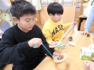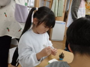 クリスマス制作では、まつぼっくりのツリーと毛糸のリースを作りました。丁寧にすき間なく毛糸を巻いていく子や途中で飽きてしまう子、さまざまで個性が出ています。