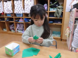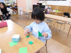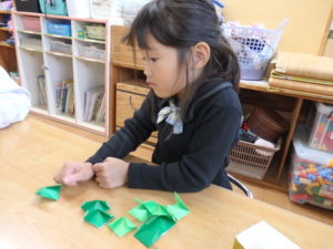 お正月制作では、門松を作りました。牛乳パックの土台に折り紙で松を作って貼りました。難しくて苦戦しましたが、職員に手伝ってもらい、頑張りました。