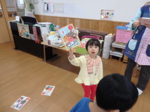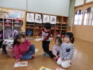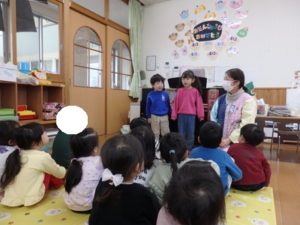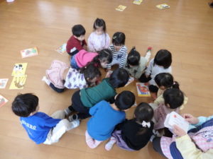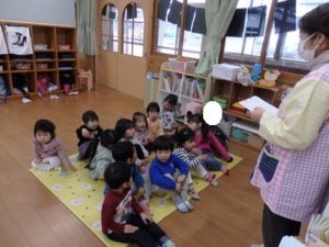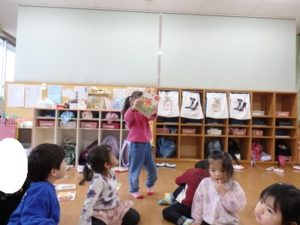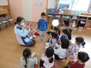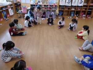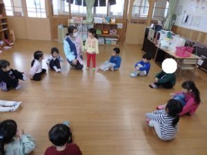 輪になってお休みの日の出来事を一人一人話してくれ、ちょっと恥ずかくて声が小さい子どももいましたが、