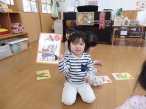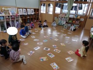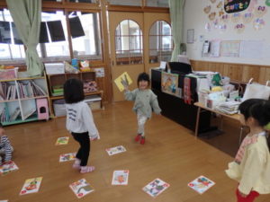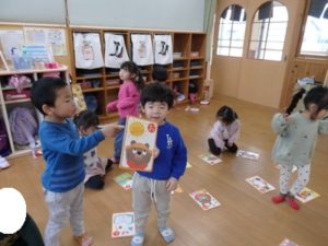 よみふだが読み上げられると、絵やひらがなを見つけ必死に取る姿が見られました。