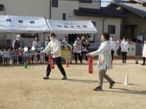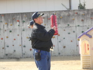 実際に消防士の方が来てくださり、保育士が消火する体験もしました。