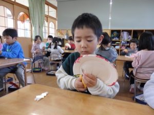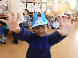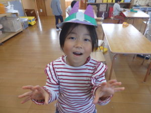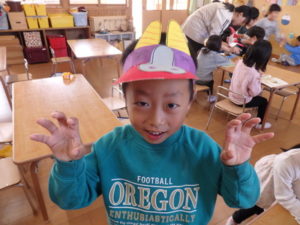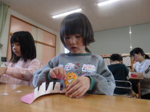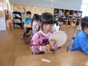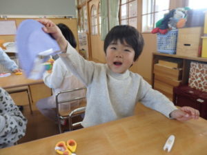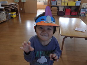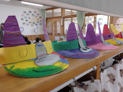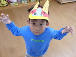 鬼のお面作りでは、前日の続きを取り組み、角・鼻を貼って顔を描いて仕上げました♪