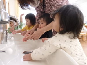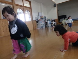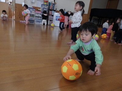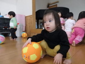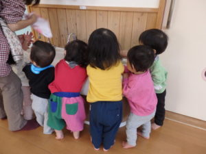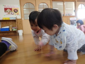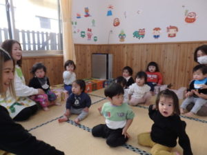 音が聞こえてくると、ジッと耳を傾けたり、保育者の動きを目で追ったりと、音やリズムに興味を示す姿が見られました。