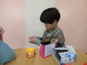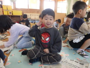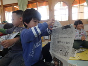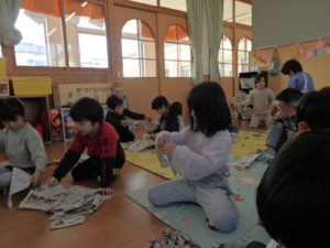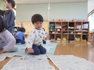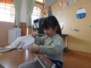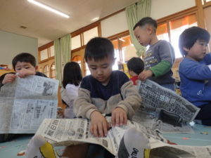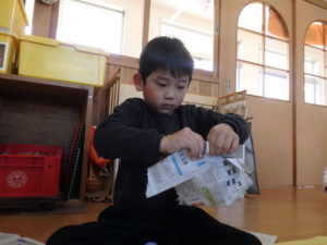 製作が終わっている子は、鬼👹に投げる豆を新聞紙で作りました。