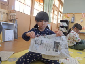 新聞紙を小さくちぎり、力を入れながら上手に丸める事ができています。