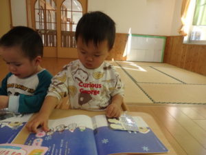 絵本のページを1枚ずつつまんでめくり、読む姿も見られました。