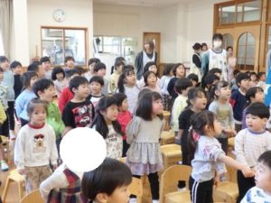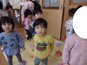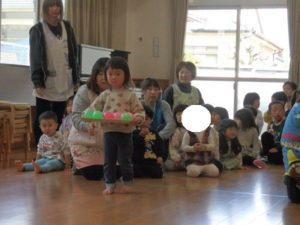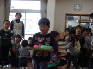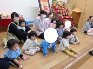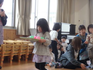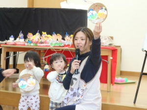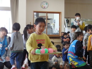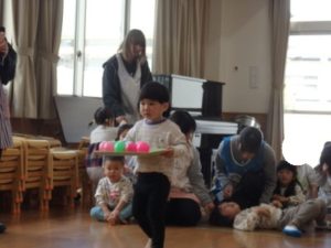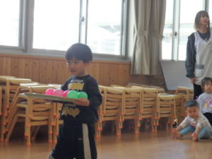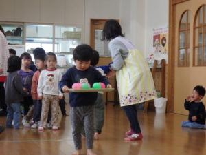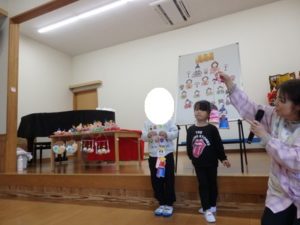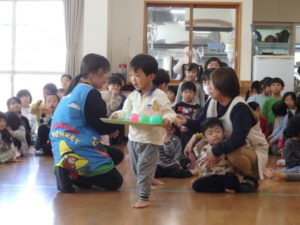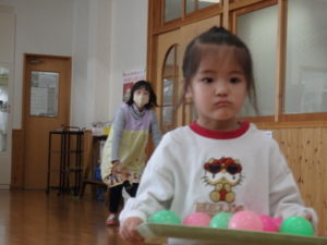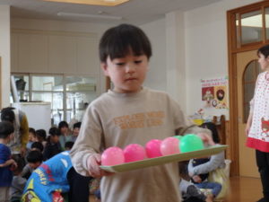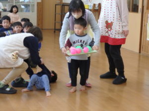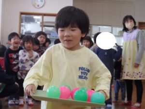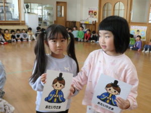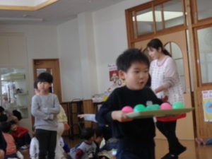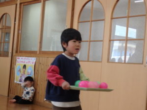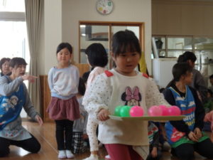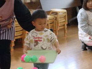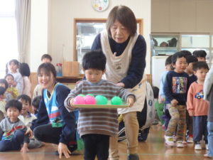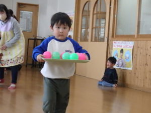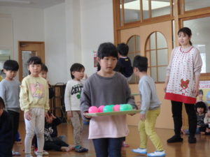 みんなで「うれしいひなまつり」を歌った後は、ひなあられに見立てたボールを運ぶゲームと、神経衰弱をしました。