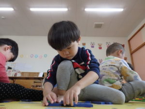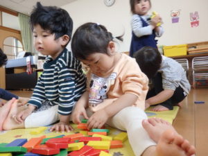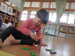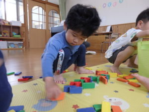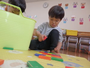 ドミノを船🚢に見立てたり、建物を作ったりとイメージを膨らませながら、友達と一緒に遊ぶ姿が見られ楽しい時間を過ごしました。
