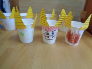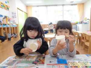 自分のクレヨンを開けて、カラフルな豆入れが完成しました!!