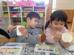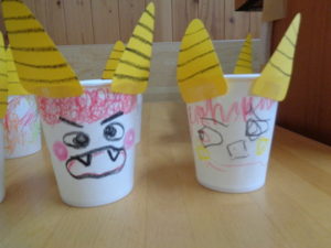 節分の絵本の読みきかせをすると、「早く豆まきしたいな~」と楽しみにしている様子でした。