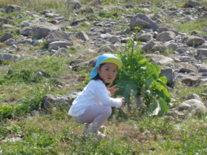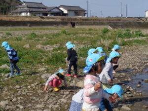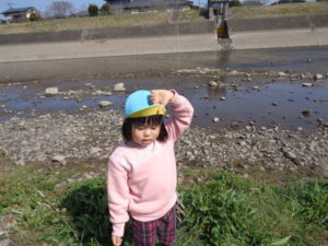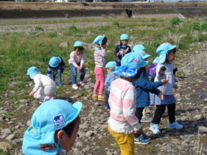 反対側の河川敷に渡り、みんなで、「おおかみと7匹のこやぎ」の歌を歌って、ミニ劇あそびが始まりました。