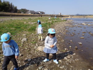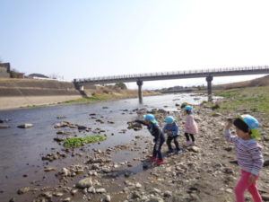 河原に降りて、川に向かって石投げをしました。みんな競争するように投げていました。
