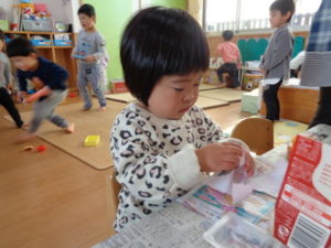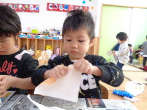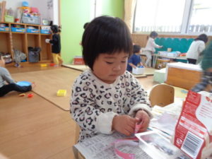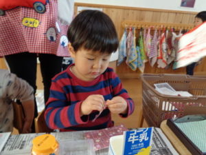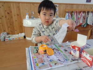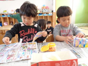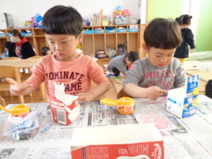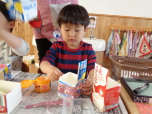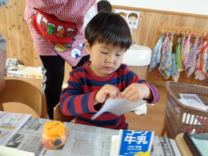 折り紙をビリビリと破いて、のりを使いペタペタと牛乳パックに貼り付けていきました。