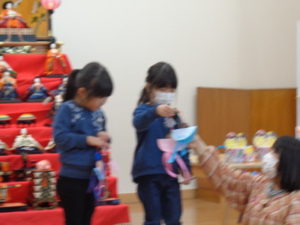 きりん組、くま組、ぱんだ組、うさぎ組さんが作ったお雛様を各クラスのお友達より紹介がありました。