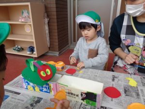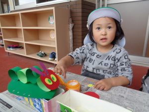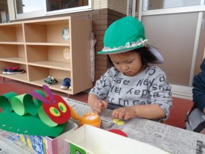 今月の製作は、絵本「はらぺこあおむし」をテーマにしました。